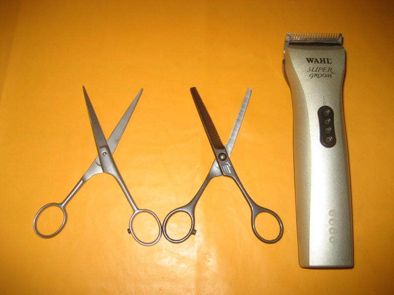Da ich als Züchterin mit sechs Setterdamen zusammen lebe und oft auch die Seesaw-fields Setter meiner Freunde trimme, habe ich mir von der Fa. Wahl die Akkuschermaschine „Super Groom“ ( erhältlich z.B. über Ehaso) zugelegt. Für den Halter eines Hundes reicht aber eine normale, gut schneidende Schere.