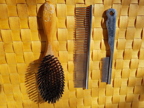 Ich empfehle, den Irish Setter täglich zu kämmen und zu bürsten. Das hat den Vorteil, daß störende Kletten und Stöckchen schnell entfernt und Verknotungen der Haare weitgehend vermieden werden. Mein Handwerkszeug besteht aus einem engzahnigen Flohkamm, einem groben Edelstahl Kamm und einer Bürste. Wie man sieht, mögen meine Hunde die Bürste zum Fressen gerne.