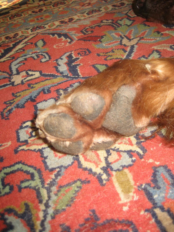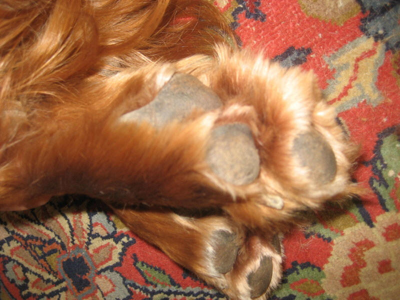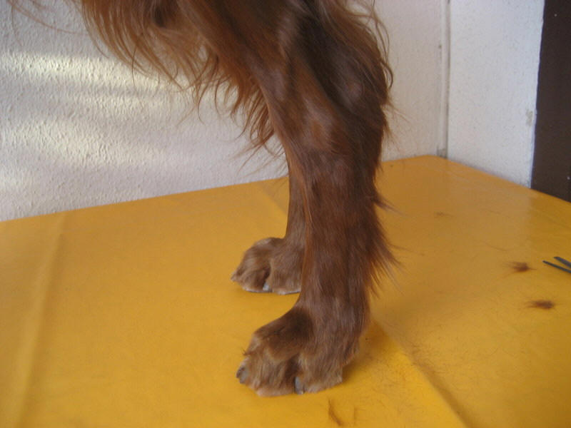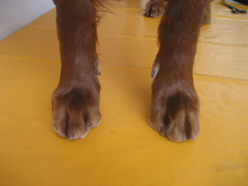Sobald draußen die Erde feucht oder naß ist und egal, ob unsere Setter dann durch den Garten toben, mit uns spazieren gehen oder im Feld arbeiten : die Pfoten verschmutzen stärker als bei trockenem Wetter. Sand und Erde bleiben in den Haaren unter den Pfoten und zwischen den Zehen hängen und fallen peu à peu beim Trocknen ab und verteilen sich in der Wohnung….. es knirscht. Auch für die Hunde ist es unangenehm, weil die feuchte Erde mit den Haaren verklumpt und zwischen den Zehen scheuert. Deshalb ist es ratsam, regelmäßig alle 3 – 4 Wochen die Pfotenbehaarung zu kürzen.
