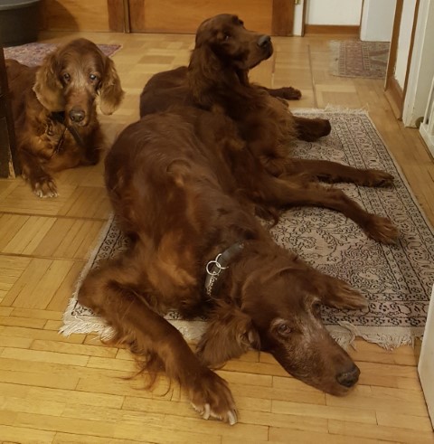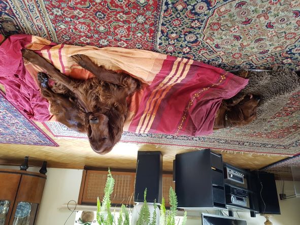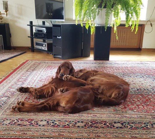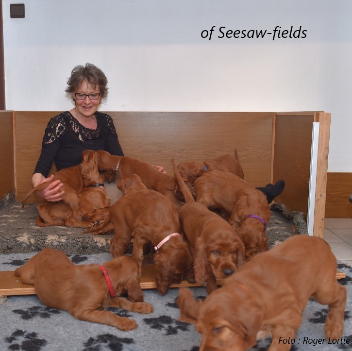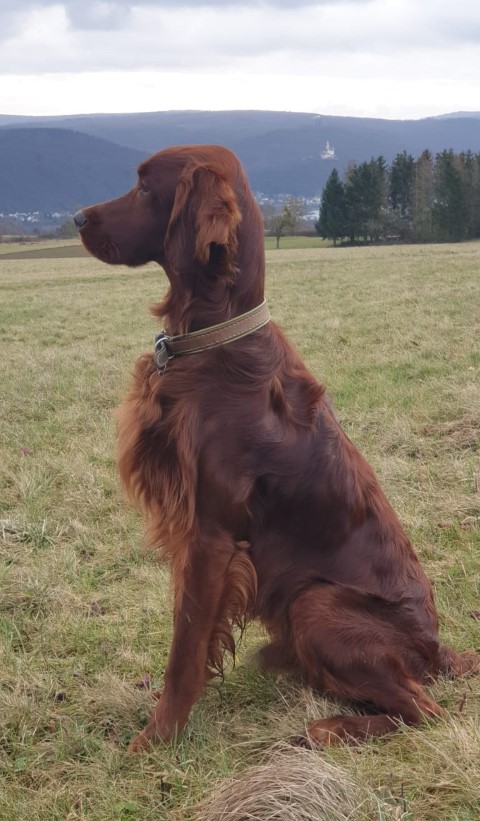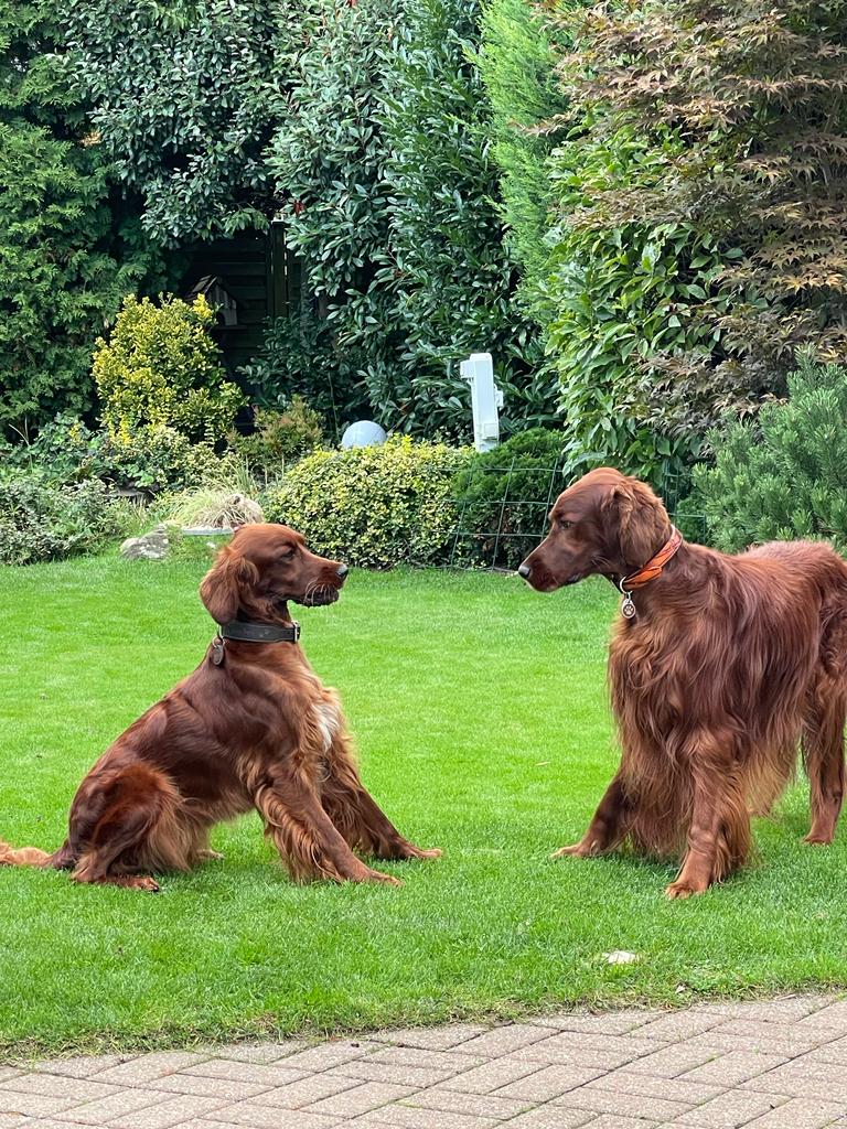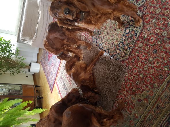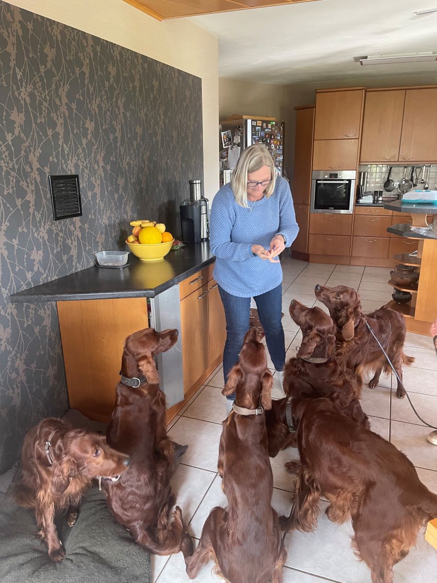 Ich hatte als Züchterin das große Glück, prima Setterleute für meine Welpen zu finden. Die 13 werden als Familienmitglieder geliebt, gepflegt und haben viel Auslauf. Einige betreiben mit ihren Besitzern Mantrailing, Agility, Apporttraining u.ä.