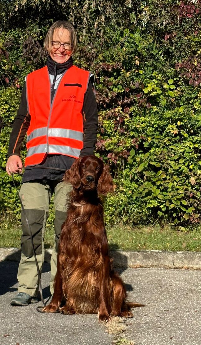 Das ist Jamie mit seiner Besitzerin Angela. Sie hat eine sinnvolle Herausforderung für ihn und sich gefunden. Am letzten Wochenende haben die Beiden die Prüfung von Jamie zum Kadaverspürhund ( ASP-Kadaversuche Baden-Württemberg ) bestanden. Zunächst wurde Angela am Freitag in der Theorie geprüft, Samstag bestand Jamie die Gehorsamsprüfung mit Sternchen und Sonntag das Team die Einsatzprüfung. Damit sind sie ein geprüftes ASP-Kadaverspürhund-Team. Applaus und Glückwünsche kamen von den Besitzern aller Geschwister und der Züchterin , also mir!