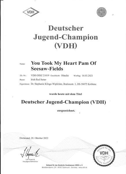 Deutscher Jugend-Champion (VDH) verliehen worden. Wir hatten Glück und Pam hat sich prima präsentiert.
