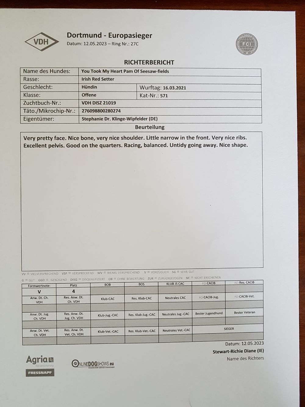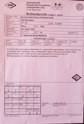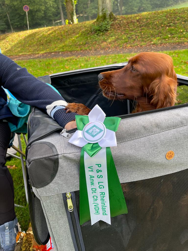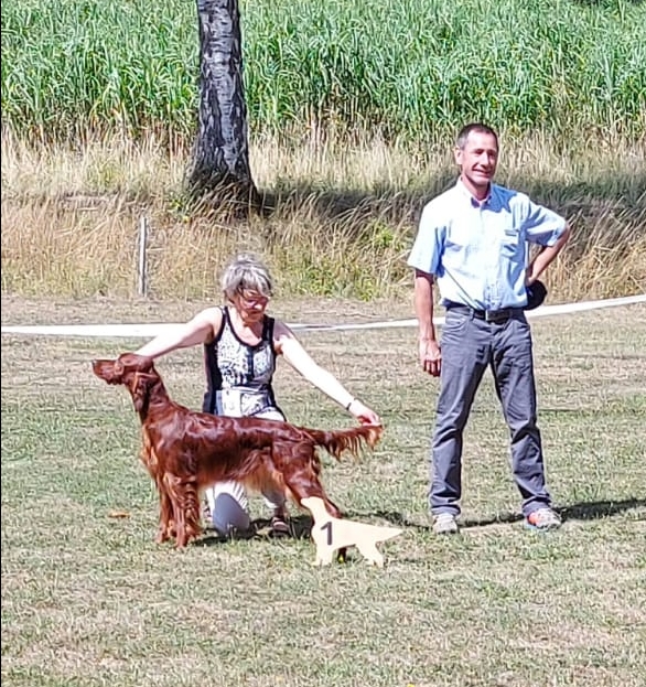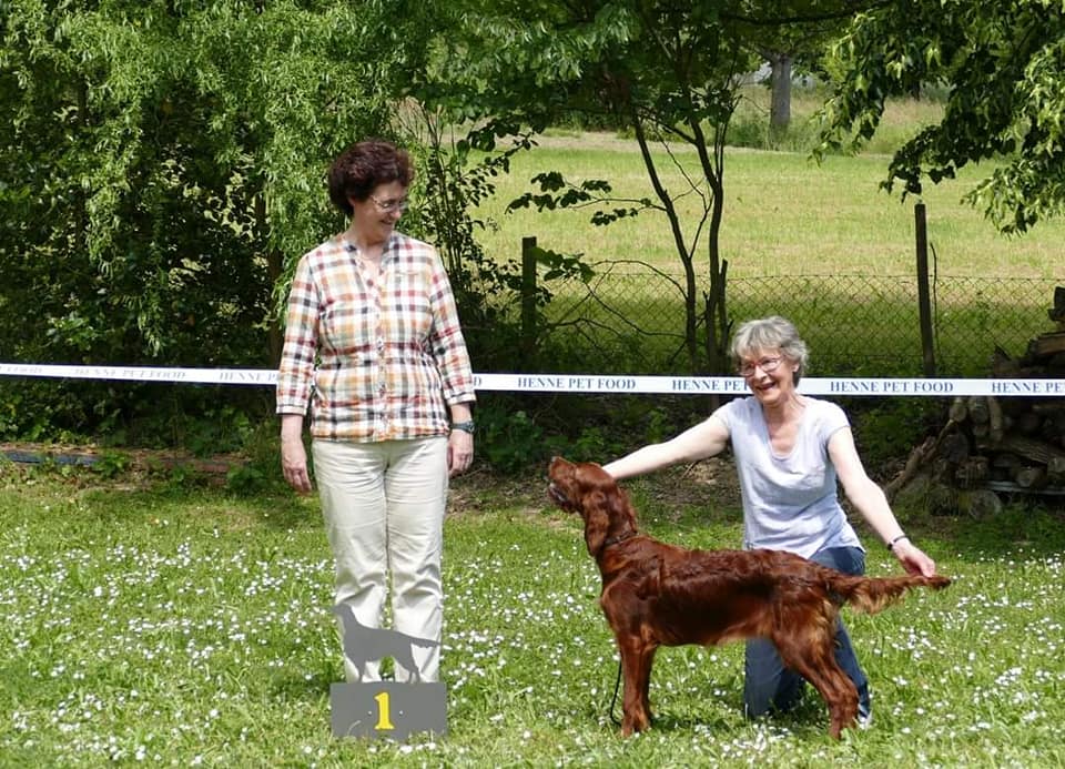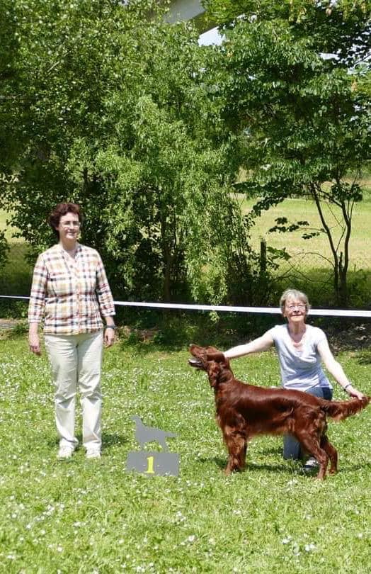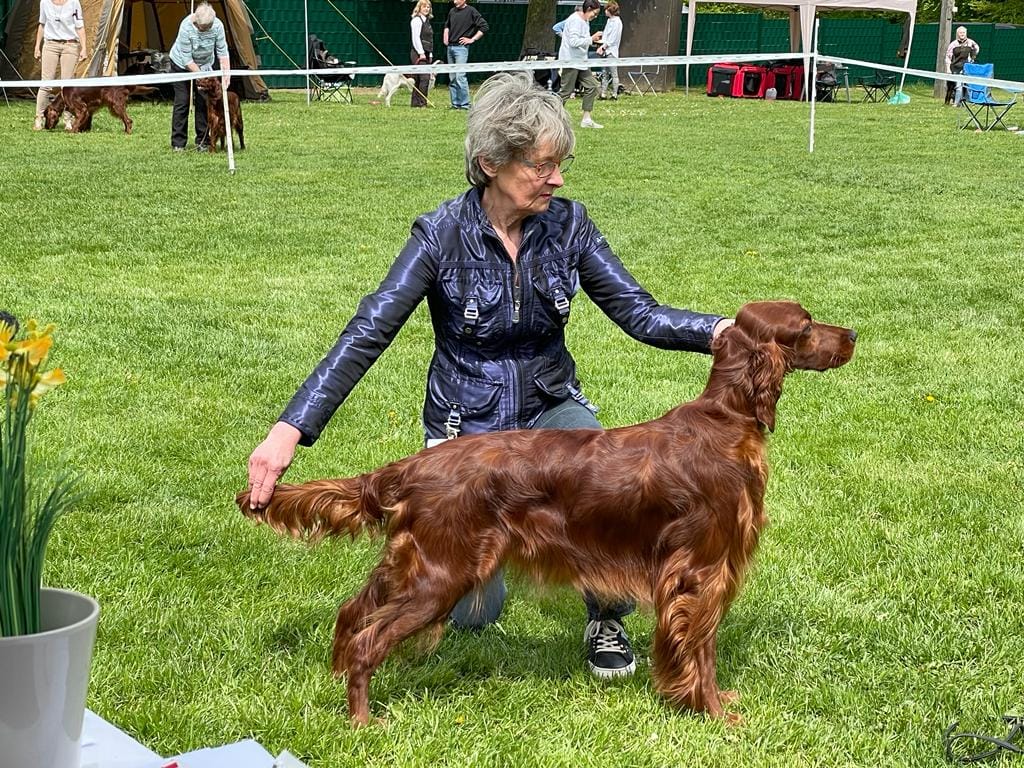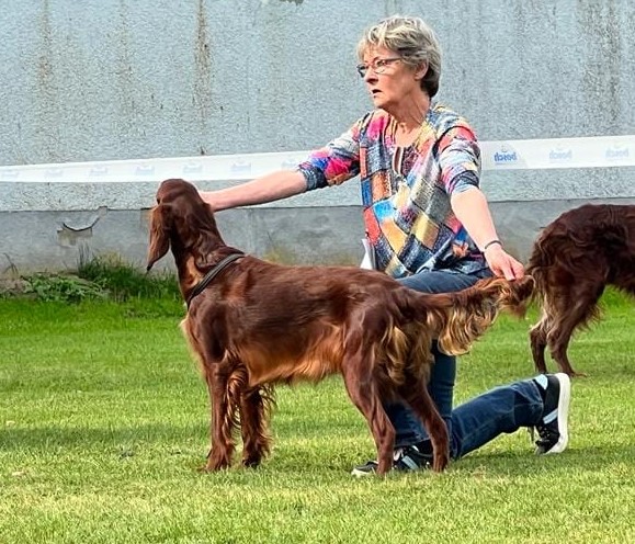 Ihre Mutter Grace erhielt in der offenen Klasse das V1, anschliessend das CACIB und wurde beste Irish Setter Hündin der Ausstellung ( BOS ).