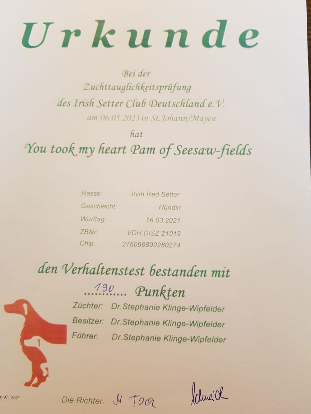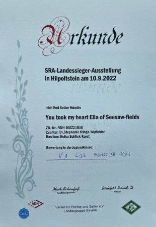 Sehr schöner Erfolg für eine Tochter von Tyron und Grace : auf der SRA Altenberg am 3.10.2022 gewann You took my heart Ella of Seesaw-fields die Zwischenklasse und erhielt von der Richterin Catherine Pil obendrein ihre erste Anwartschaft auf den Titel Deutscher Champion. Weiter so Ella und Heike.