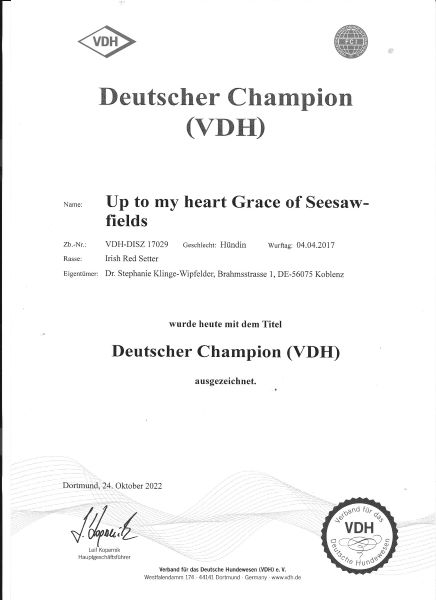 Wir haben einen neuen Champion in der Seesaw-fields Familie : Ella, Tochter von Tyron und Grace wurde der Titel Deutscher Champion (VDH) verliehen. Gratulation an Ella,Heike und Oliver und weiterhin viel Spaß am Ausstellen.