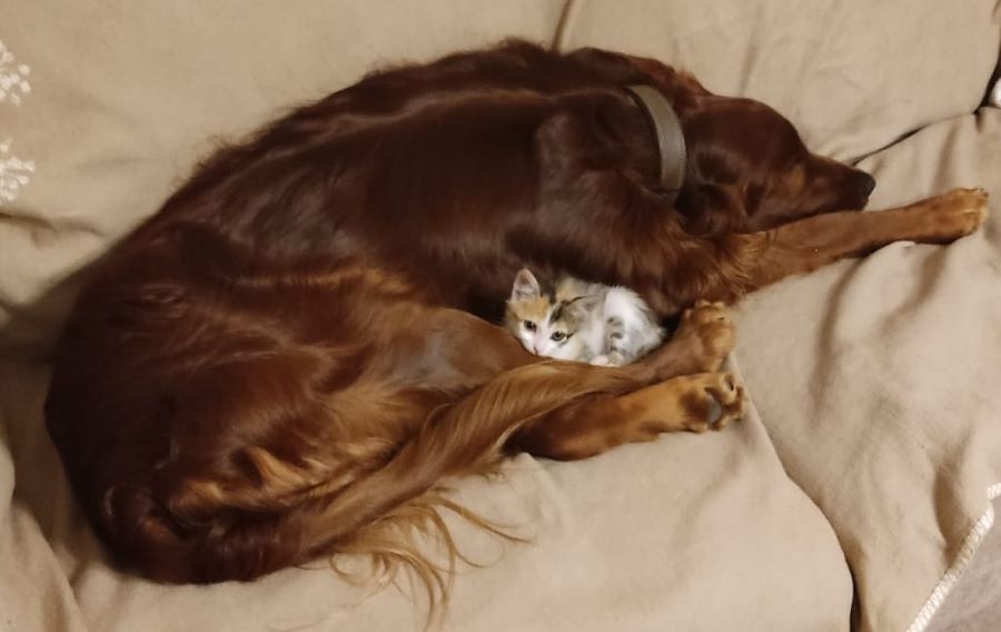 James hat aus dem Urlaub einen kleinen Freund mitgebracht. Wie man sieht,verstehen sich die Zwei prima. James lebte noch nie mit einer Katze zusammen und hat sich binnen einer Woche auf den kleinen Wildfang eingestellt. Wenn der mit der Tatze rumfuchtelt, weicht James aus. Ich glaube, die Katze hat jetzt schon die Pole-Position erobert.