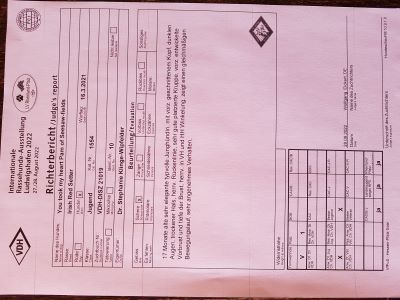 Wir haben am 9.3.24 die internationale Ausstellung in Offenburg besucht. Pam wurde Zweite von 12 gemeldeten Hündinnen in der offenen Klasse ( V2 ) , Wickie Dritte von Dreien ( V3)