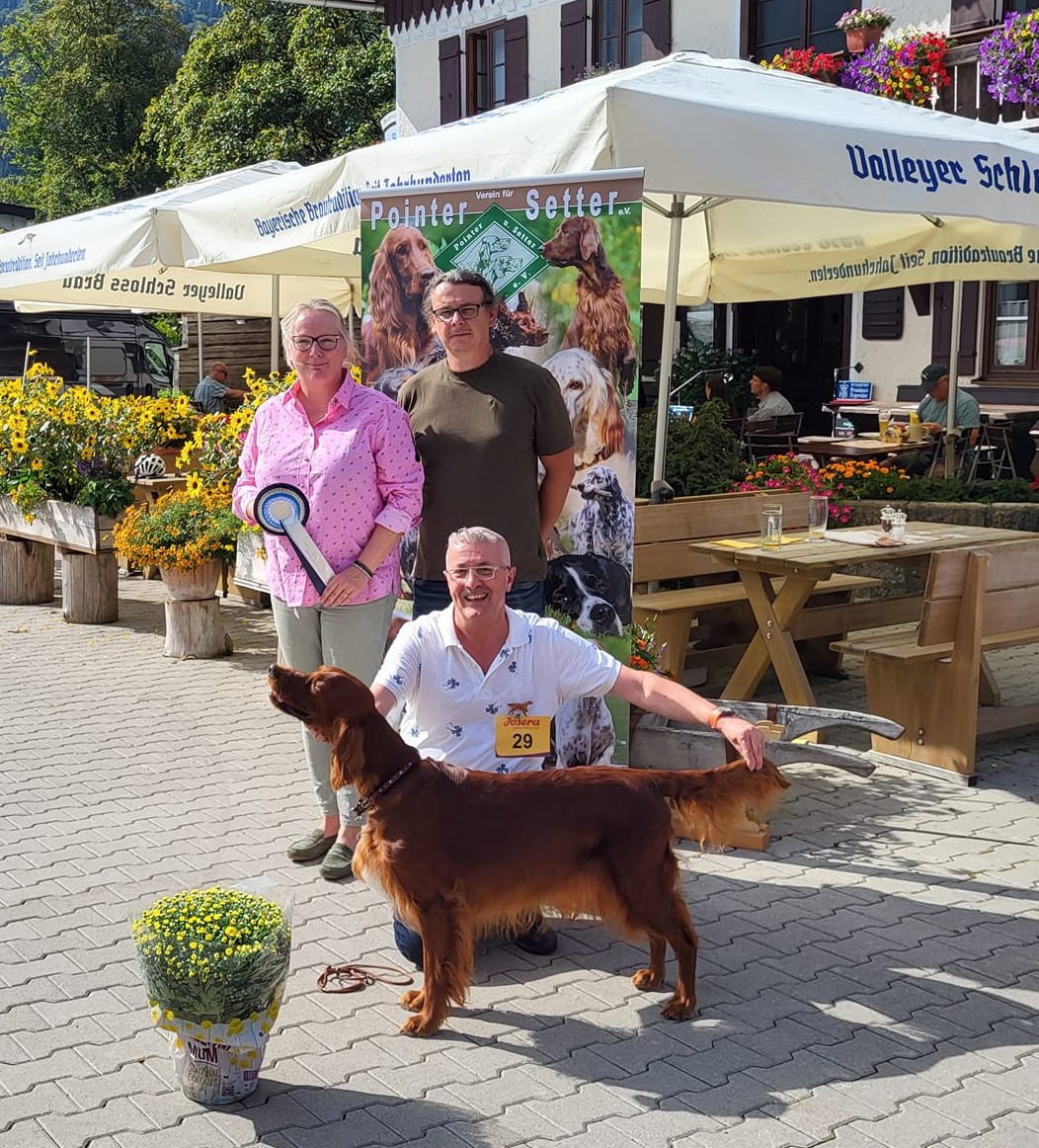 Sonntag , den 17.9.2023 wurde das Team verstärkt von den Schweizern. Unter der Richterin Frau Christiane Lohmann erhielt Always in my heart Onida das V3 in der Jugendklasse und Take a look at Numees V1 offenen Klasse, CAC, BOS ( beste Irish Setter Hündin, BOB (= bester Irish Setter ) und best in show...wow !!!Lord V2, CAC Res., Ella V3.