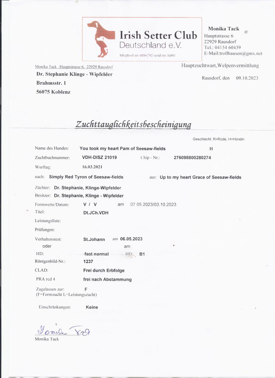 Grosse Freude : Pams Zuchttauglichkeitsbescheinigung bringt die Post.