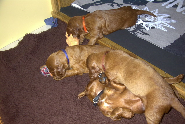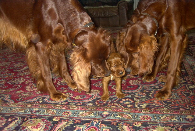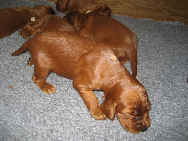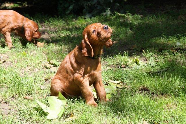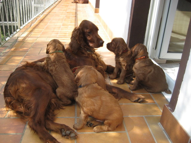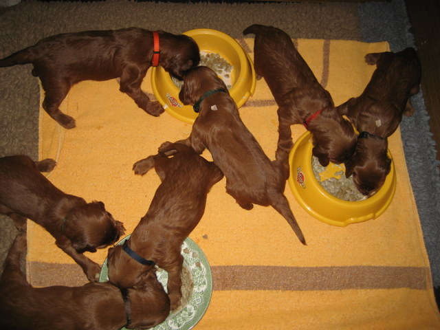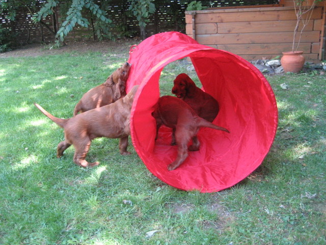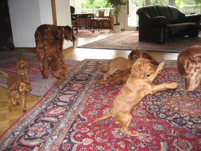 Fünf Wochen und älter : sie werden setterähnlich, erkunden die Wohnung , die Terrasse und den Garten und dürfen sich auch richtig dreckig machen