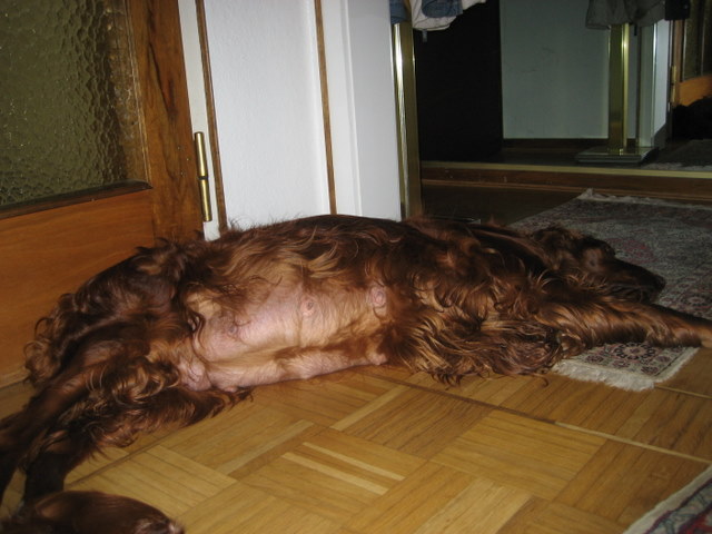 Nur im Liegen sieht man das feste pralle Bäuchlein mit den deutlich verdickten Zitzen.