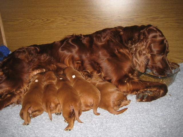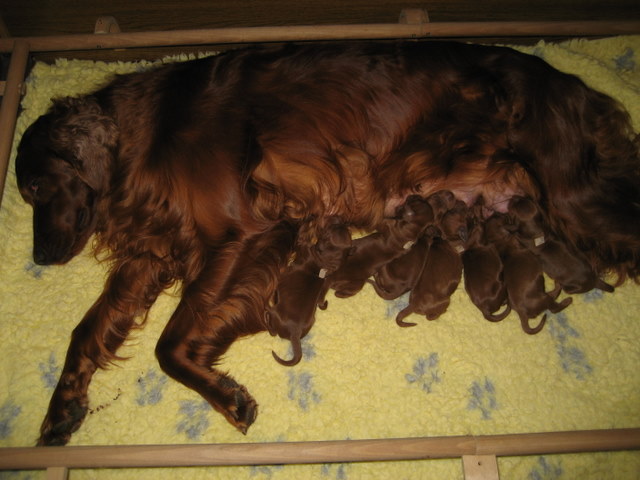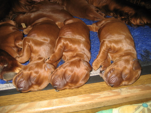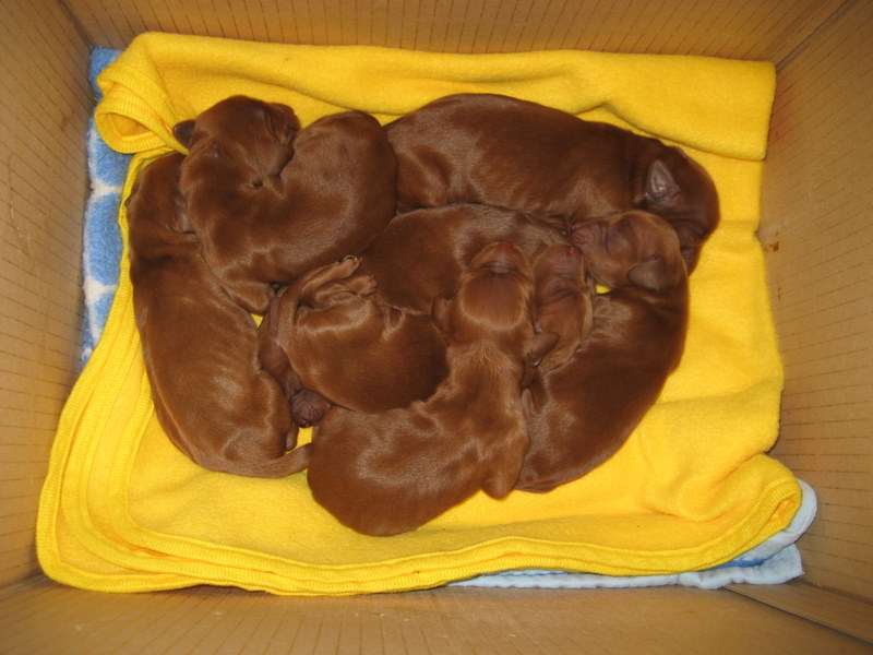 Die Welpen sind einen Tag auf der Welt : Augen und Ohrlöcher sind noch zu, d.h. die Welpen sehen und hören noch nichts. Die Näschen und die Fußsohlen sind noch rosa, nur das Fell ist schon mahagonifarben und glänzend.