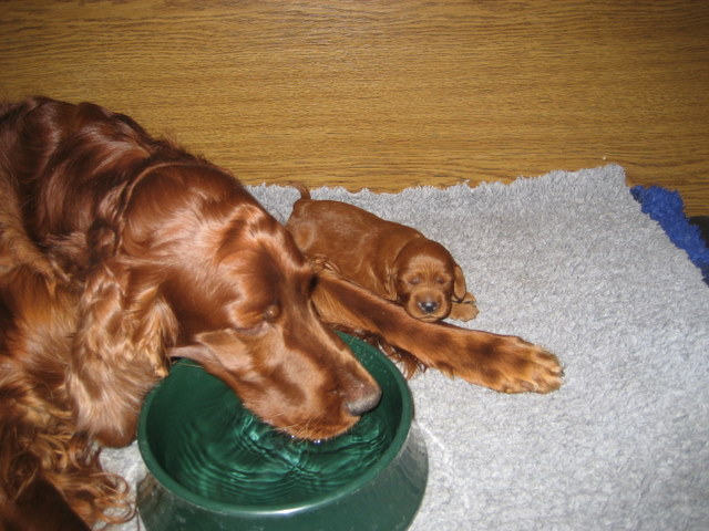 Die Hundemütter verlassen die Wurfkiste in der ersten Zeit nur ungern. Deshalb pflege ich sie in der Kiste mehrfach am Tag zu füttern und mit Wasser zu versorgen.