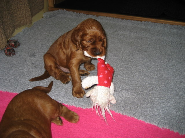 Vier Wochen alt : die Welpen beginnen miteinander und mit Spielzeug zu spielen